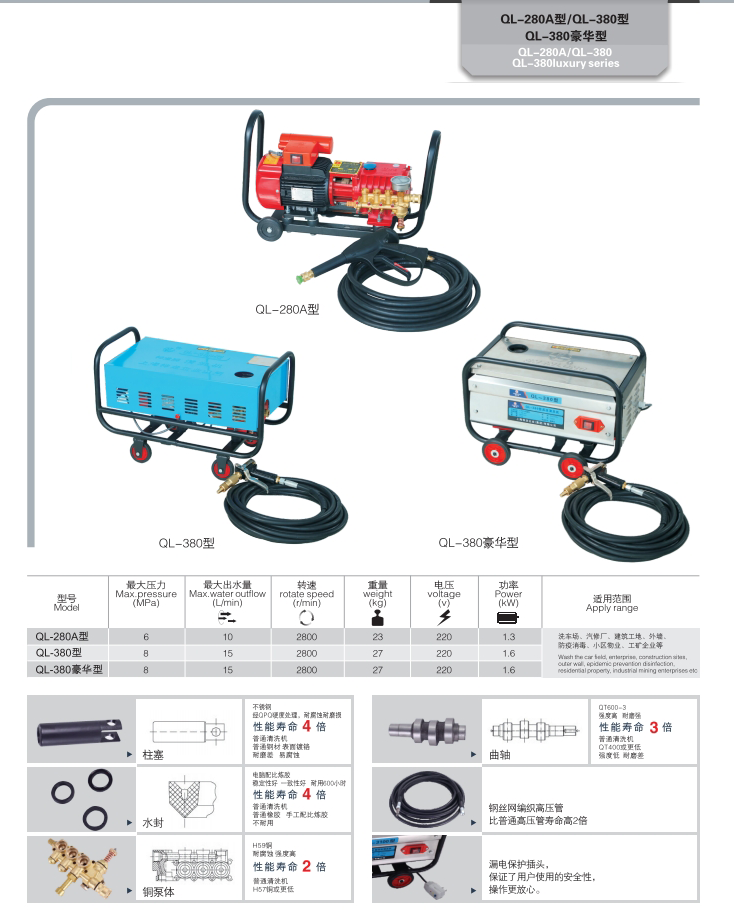 上海神龍集團生產(chǎn)的高壓清洗機QL-280A型/QL-380型/QL-380豪華清洗機,適用洗車場、汽修廠、建筑工地、外墻、防疫消毒、小區(qū)物業(yè)、工礦企業(yè)等。