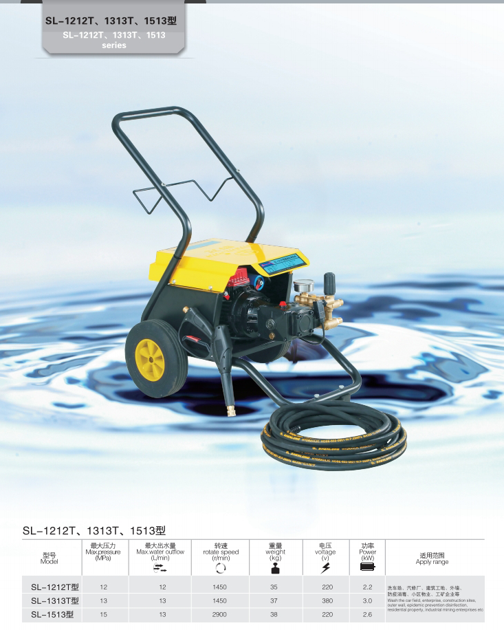 上海神龍集團(tuán)生產(chǎn)的高壓清洗機(jī)SL-1212T、1313T、1513型清洗機(jī),適用洗車(chē)場(chǎng)、汽修廠、建筑工地、外墻、防疫消毒、小區(qū)物業(yè)、工礦企業(yè)等。