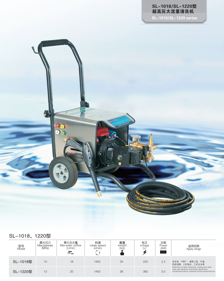上海神龍集團(tuán)生產(chǎn)的高壓清洗機(jī)SL-1018/SL-1220型超高壓大流量清洗機(jī),適用洗車(chē)場(chǎng)、汽修廠、建筑工地、外墻、防疫消毒、小區(qū)物業(yè)、工礦企業(yè)等。